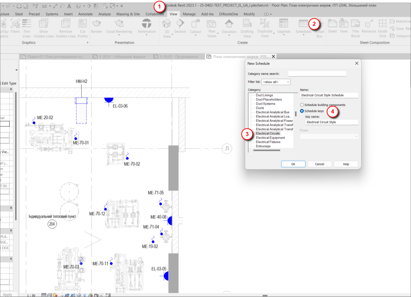 Створення ключової таблиці для категорії «Електричні мережі» нічим не відрізняється від створення подібної таблиці для будь-якої іншої категорії. Все досить просто: View – Schedules – Electrical Circuits – Key Schedule