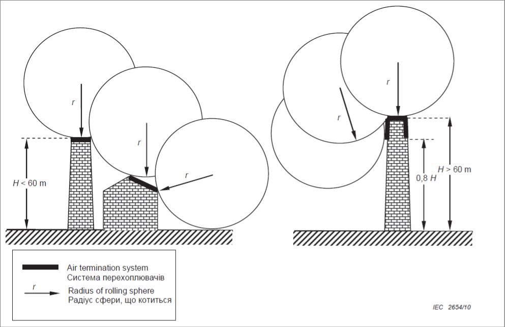 У статті будемо розглядати побудову системи перехоплювачів на основі методу сфери, що котиться. Цей метод є прийнятним для усіх випадків і вважається відповідним, якщо жодна точка будівлі, що захищається, не торкається сфери радіусом R, залежно від класу LPS, що котиться навколо та верхівкою будівлі в усіх можливих напрямках. Таким чином, сфера торкається тільки перехоплювачів.